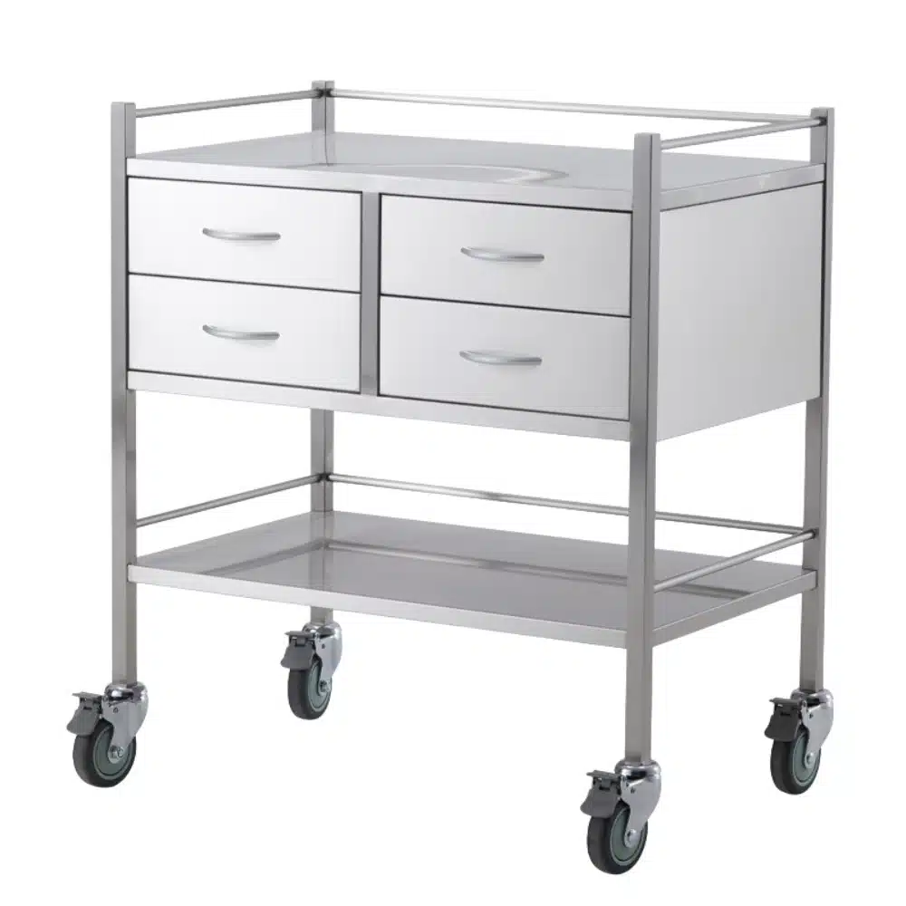 - عربة أدوات طبية مصنوعة من الفولاذ المقاوم للصدأ درجة 304 بتصميم قوي يوفر الدعم اللازم للأدوات الطبية.